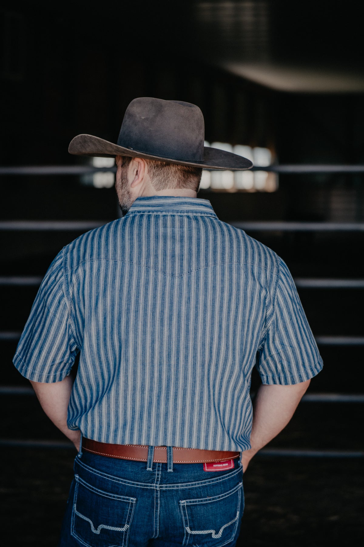Embrace classic Western style with this men’s short-sleeve button-up. Featuring a classic blue and white pinstripe base, this shirt combines timeless style with rugged appeal! The chest pockets add a practical, authentic touch, perfect for stashing small essentials or adding to the Western aesthetic. Whether you're on the ranch or out in town, this shirt is the ideal blend of comfort and style for any modern cowboy!