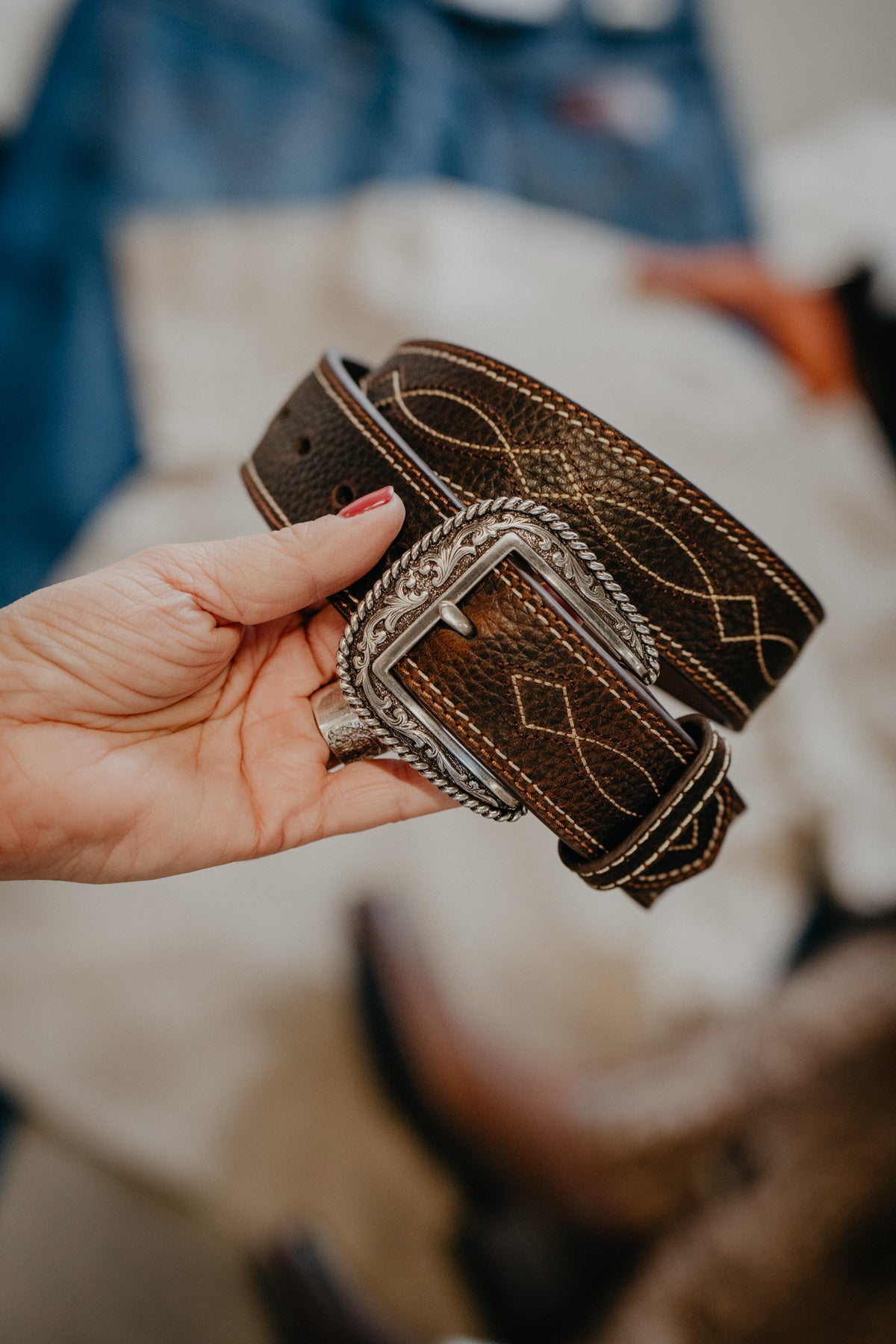 We love genuine leather belts and to add to this durable belt there is a beautiful boot stitch pattern that runs throughout the whole belt.