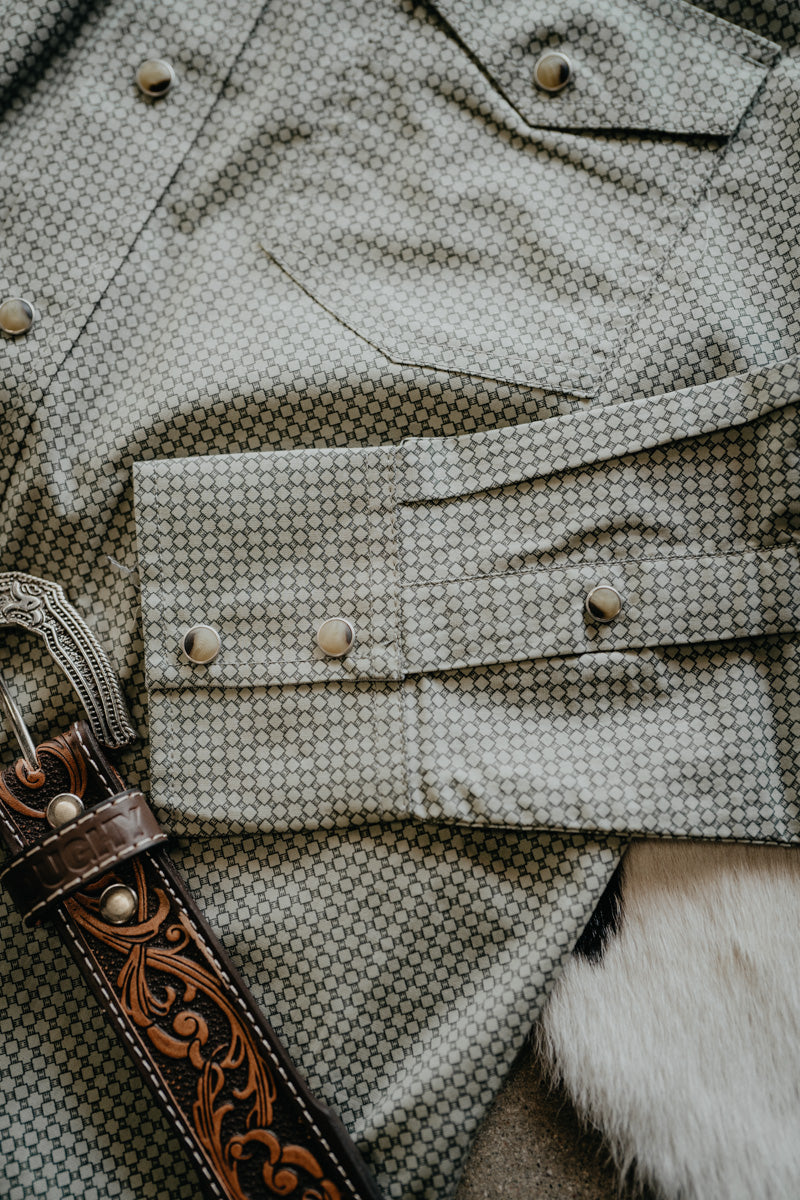 'Gavin' Men's Wrangler 20X Green/Grey Geometric Pearl Snap Shirt (S-XXL)