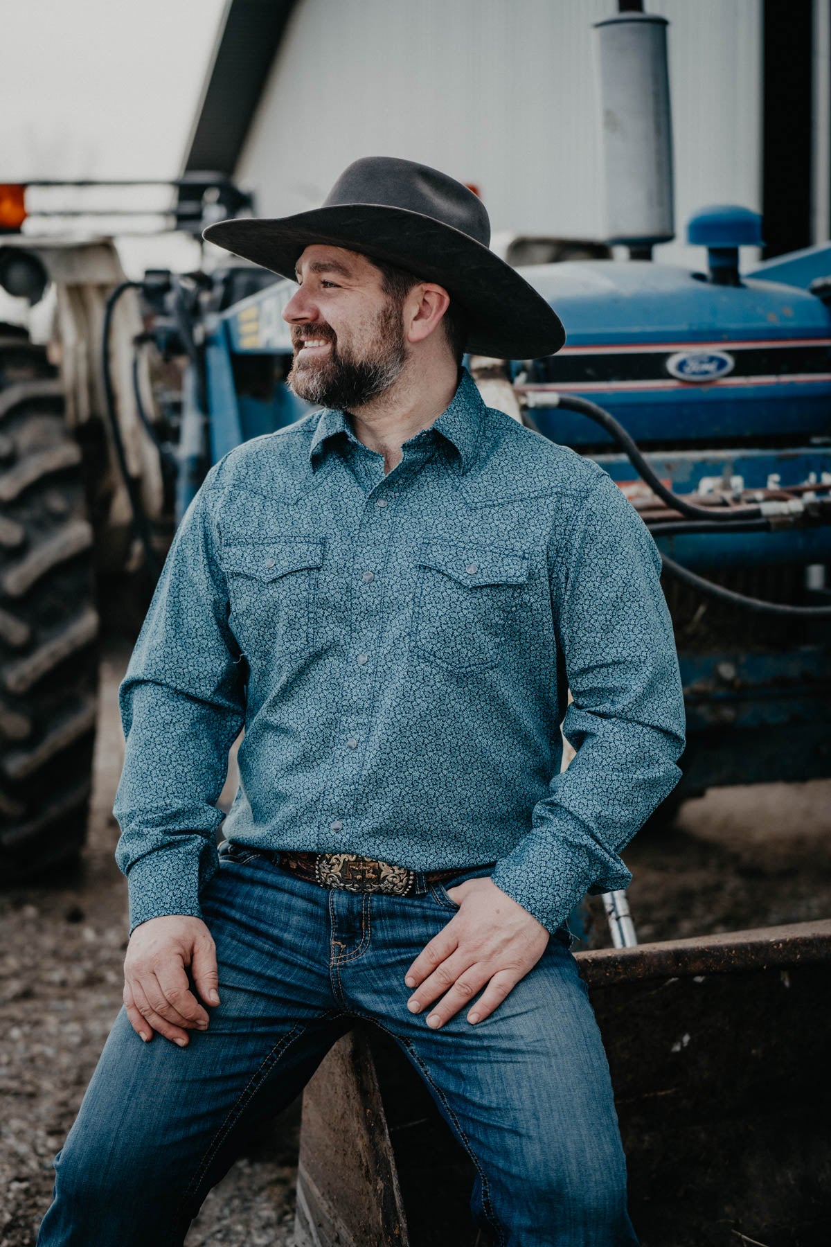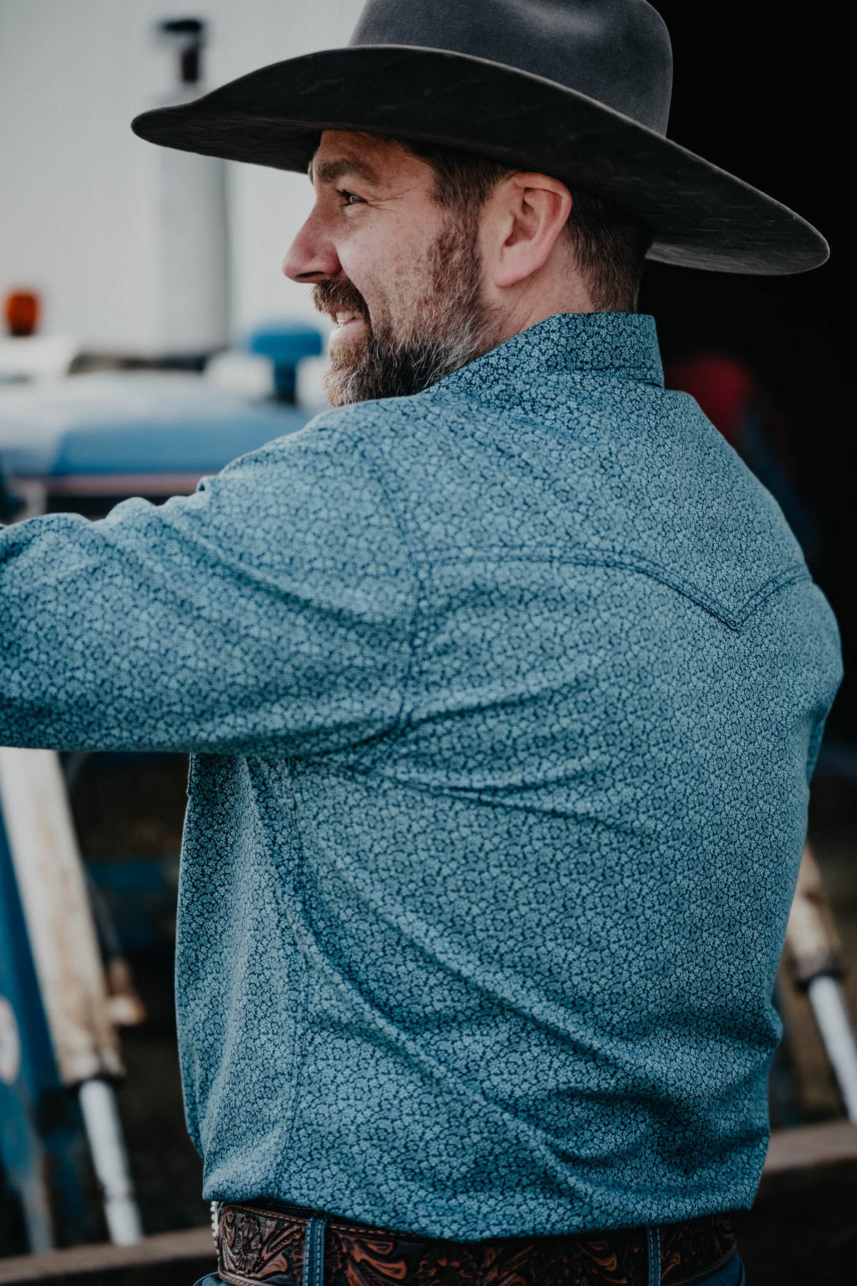 Wrangler has done it again, this classic looking men's shirt features a tonal blue botanical pattern and dark marbled pearl snap finishes. With contrast plain denim coloured cuffs and interior, these blue colours are sure to look good on any man!