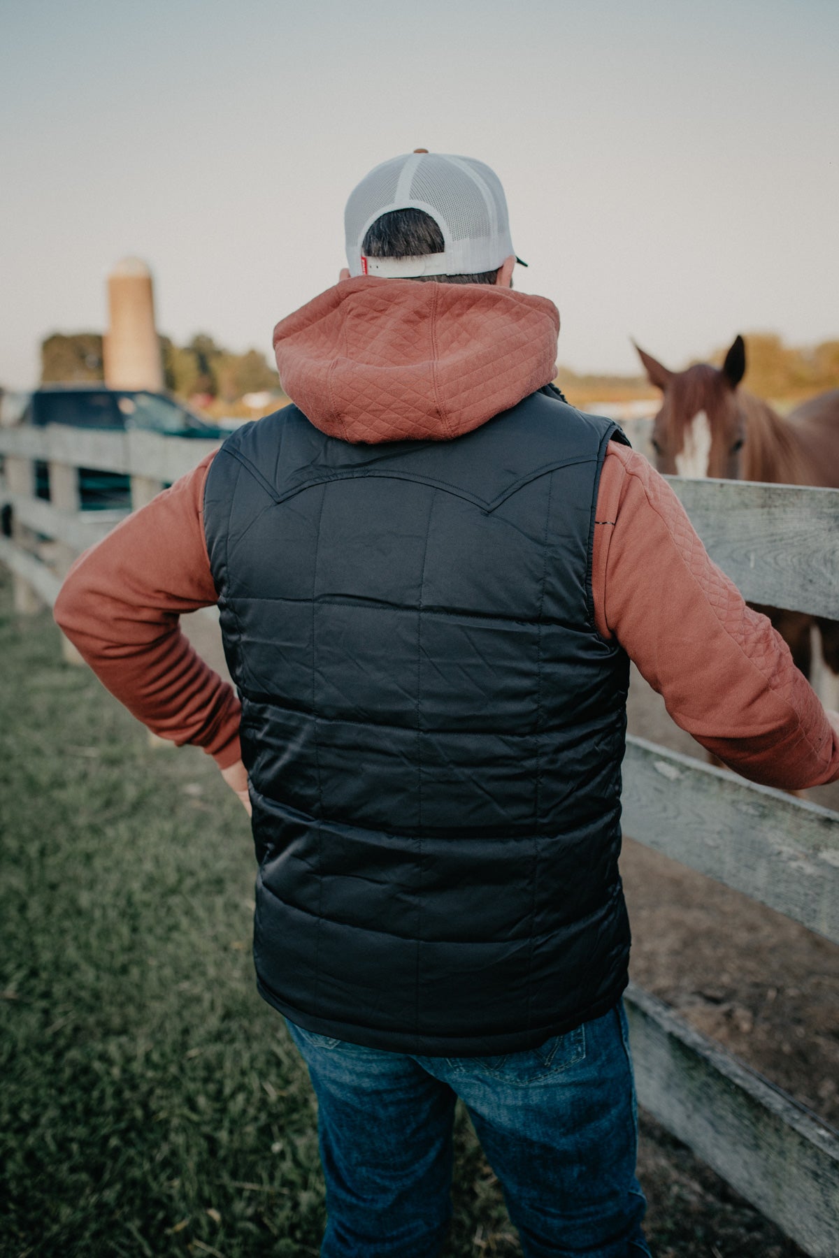 A new style quilted vest from Kimes that we anticipate to be a customer favourite! Between the sleek, simple look - solid black with tonal black of black longhorn logo embroidery with will pair with any shirt or sweater, durable construction, and the cozy black sherpa lining that offers comfort and warmth, along with the subtle western yoke that adds western style.