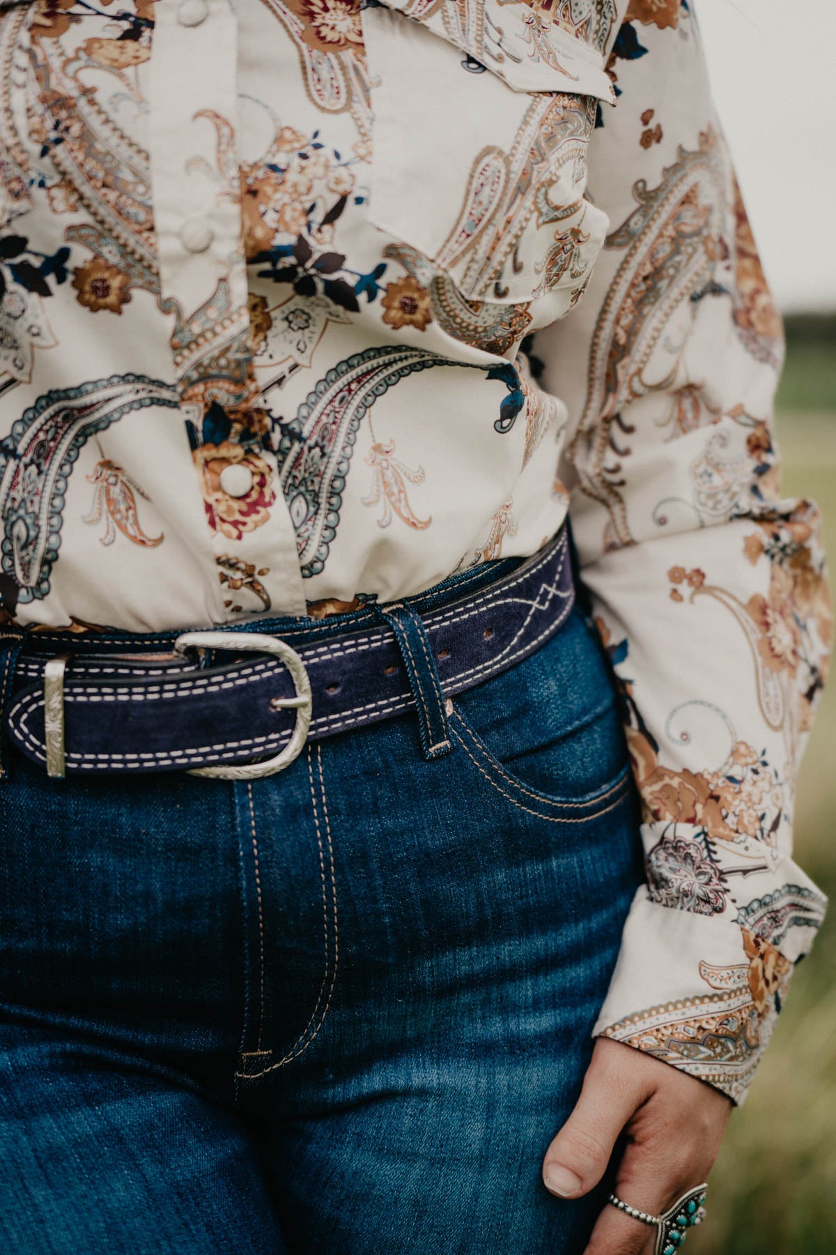 Belt Sizing Tips: Generally speaking, you want to add approx 4" to your denim sizing if you plan to wear with a large buckle, 6" if you plan to wear with existing hardware or a smaller buckle. For example, Tara is a consistent size 27 in denim and comfortably wears a 34" Double J belt with the hardware it come with.