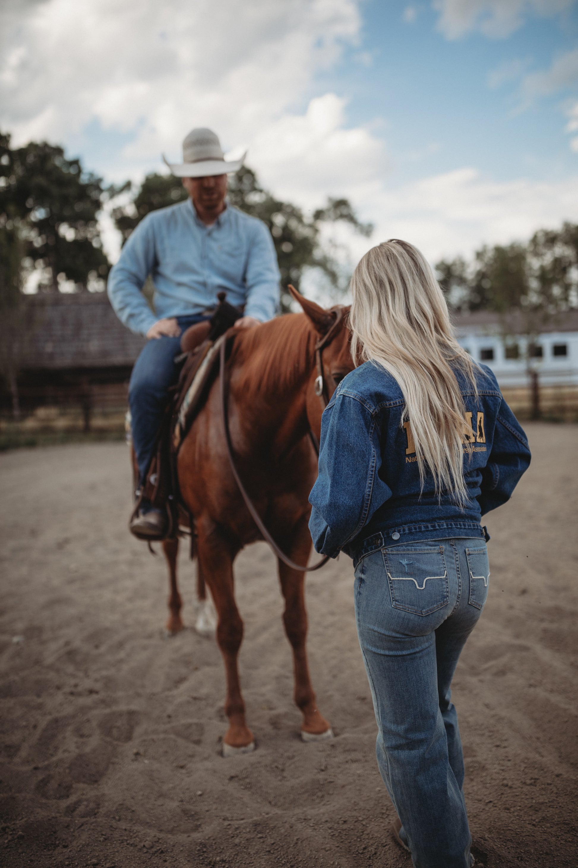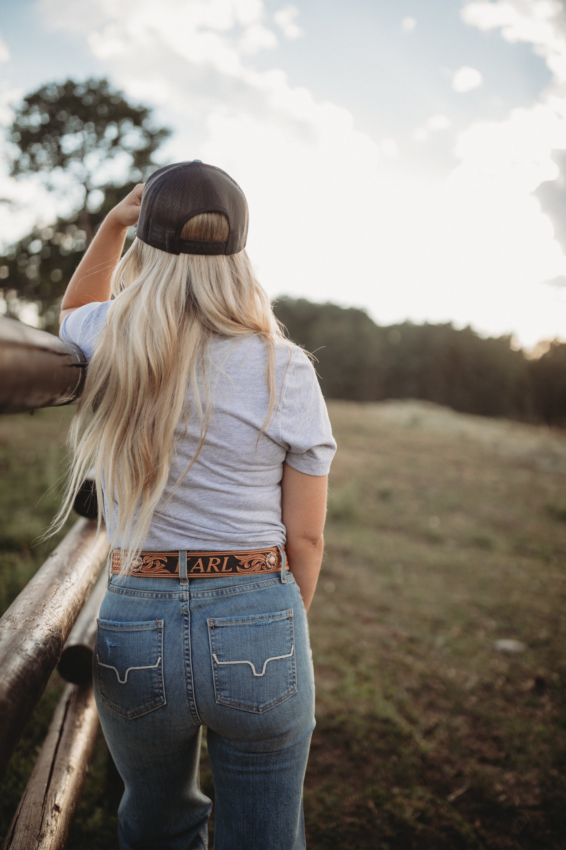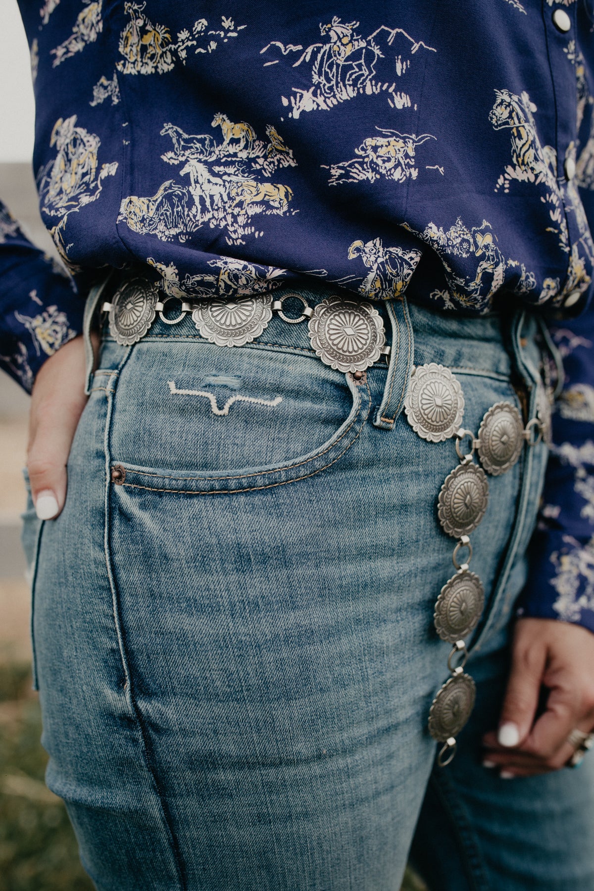 Love a good fitting, high rise jean with a soft feel and nice stretch? Then you will LOVE the Olivia stove top high rise wide leg jean by Kimes Ranch! This gorgeous medium wash jean features a high rise (10.5" front, 15" back, which is slightly higher than Sarah and the Jennifers), fitted bum and thigh, and then flares out mid thigh to finish at a raw hem and 10" leg opening. Subtle hand sanding, ever so slight distressing on the pockets, and bright contrast longhorn logo stitching are the icing on the cake. Plus, don't forget the ohhh so soft premium denim with just the right amount of stretch that will have you living in and loving these jeans!