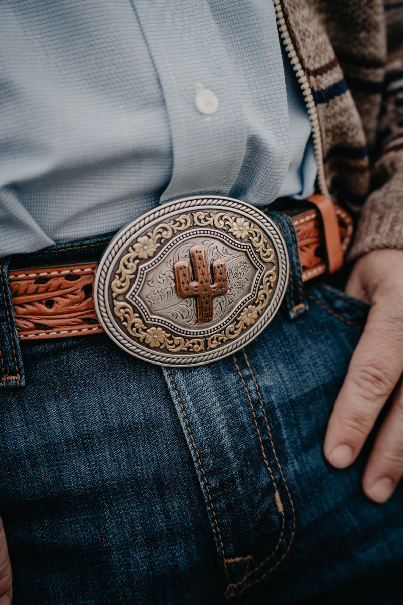 This oval belt buckle combines rugged charm with refined details—a gleaming copper cactus takes center stage, framed by a textured rope edge and finished with gold floral accents. Perfect for adding a touch of playful southwestern flair to your wardrobe.
