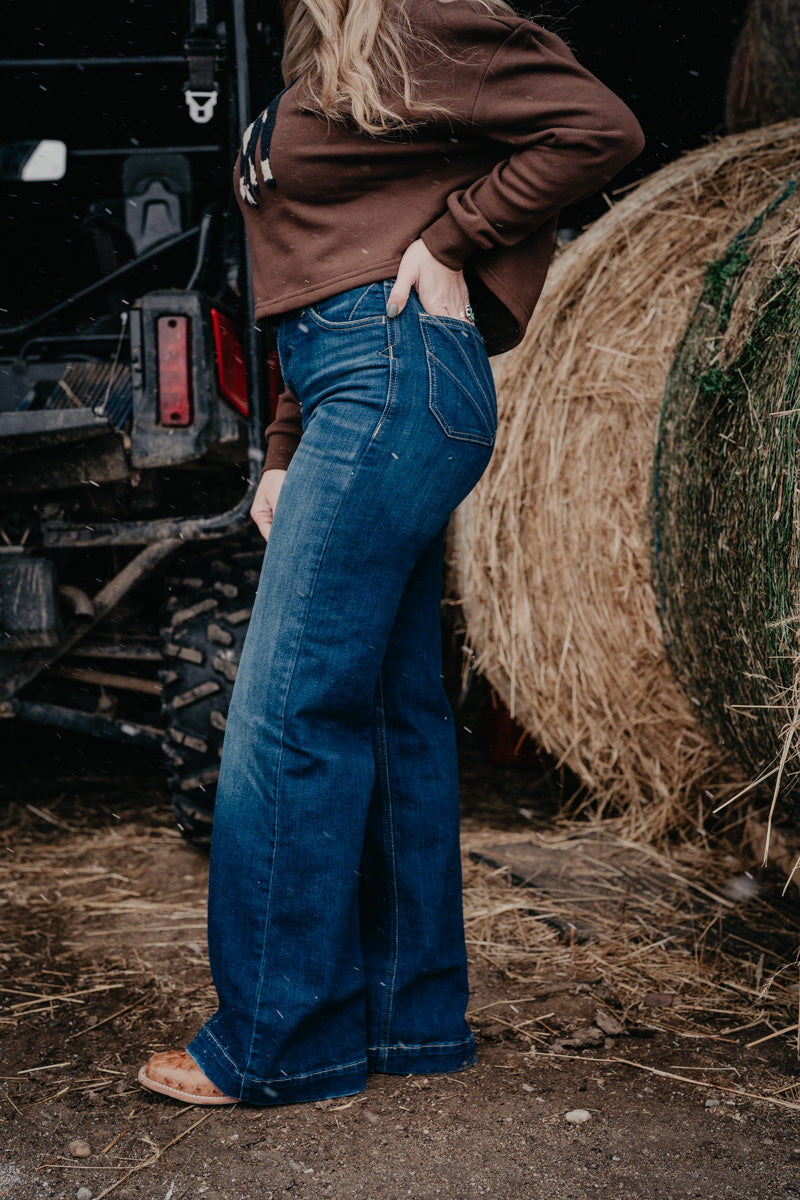 Introducing the 'Penelope' – where vintage vibes meet modern comfort! This ultra high rise wide leg jean in a rich dark wash is your ticket to effortless Western style. With its clean, understated pocket detailing and relaxed silhouette, Penelope is your perfect grab and go jean! These Ariat jeans deliver that perfect balance of timeless appeal and contemporary flair!