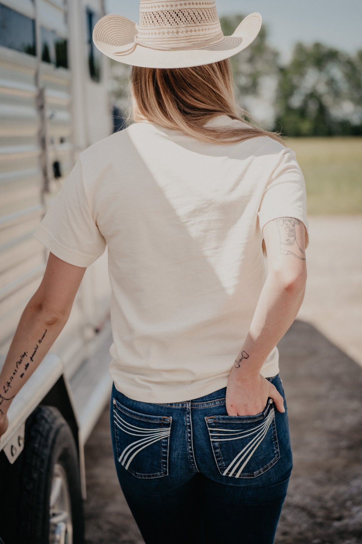 Sarah paired her tee with our Olivia High Rise Stove Top Raw Hem Wide Leg jeans by Kimes Ranch. Grace paired her tee with the new 'Androver' Dojo Trouser by 7FMK (34.5" Inseam).