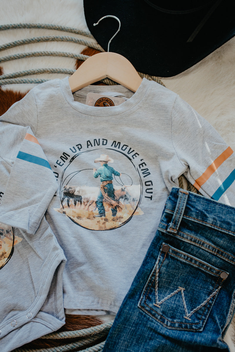 Keep your little cowboy cozy and cute with the 'Ray' Boys Head'Em Up Long Sleeve Graphic Tee. Made in a soft heather grey colouring, this long-sleeve features a fun roper cowboy graphic screen-printed on the front, perfect for tiny wranglers aged 3-6 months up to 5T. It’s an easy, playful way to dress your baby in Western charm while keeping them snug all day long.