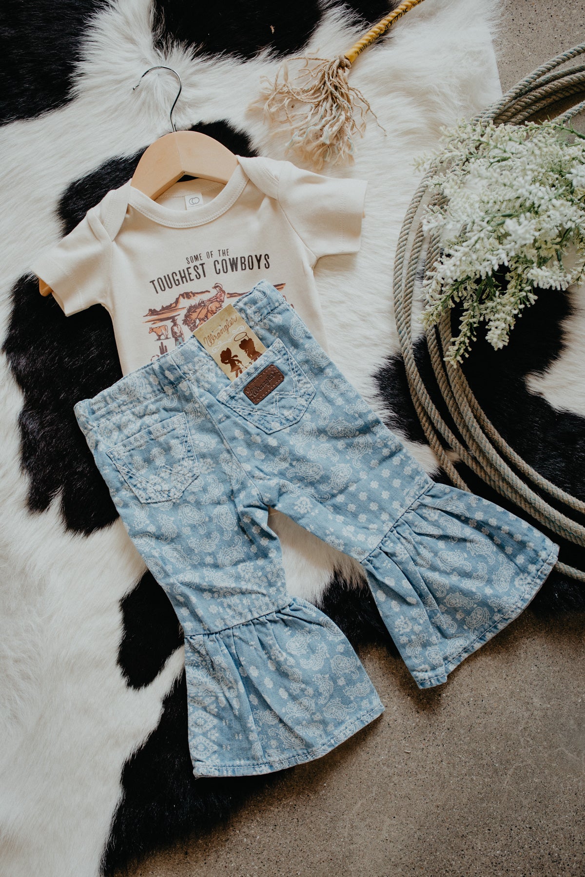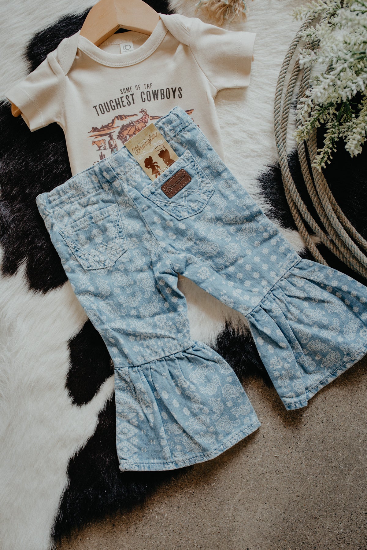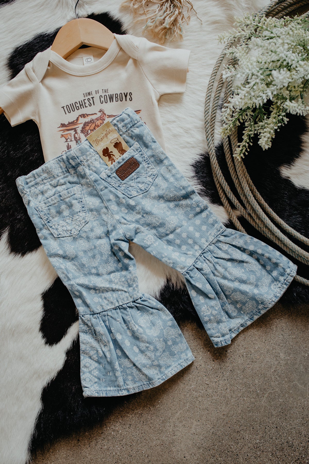 Y'all how adorable are these flare jeans by Wrangler!? Your little cowgirl will look too cute in these denim pull on pants with elastic waistband. Pair with cowgirl booties and she's ready to take on the day!