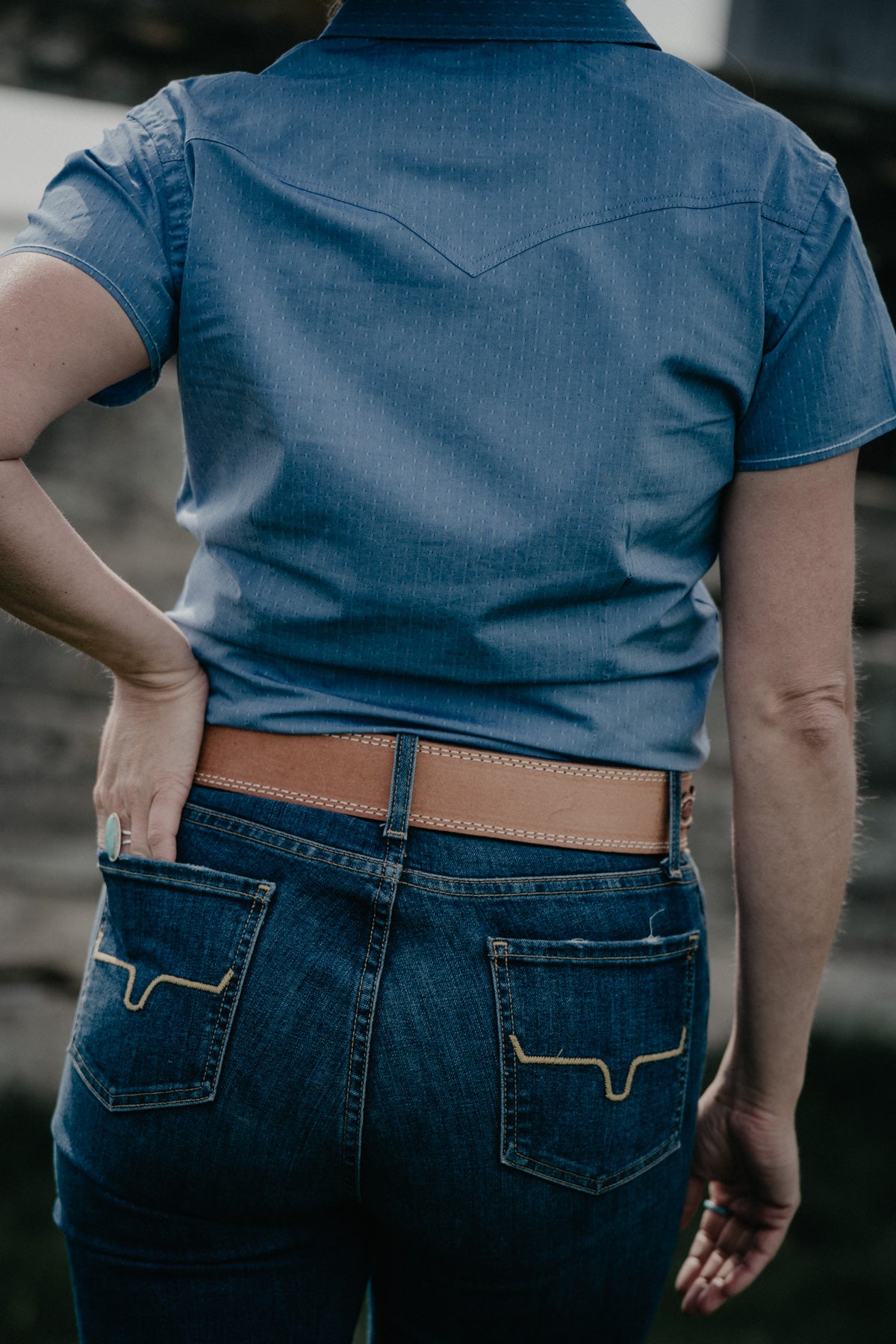 Belt Sizing Tips: Generally speaking, you want to add approx 4" to your denim sizing if you plan to wear with a large buckle, 6" if you plan to wear with existing hardware or a smaller buckle. For example, Tara is a consistent size 27 in denim and comfortably wears a 34" Double J belt with the hardware it come with.