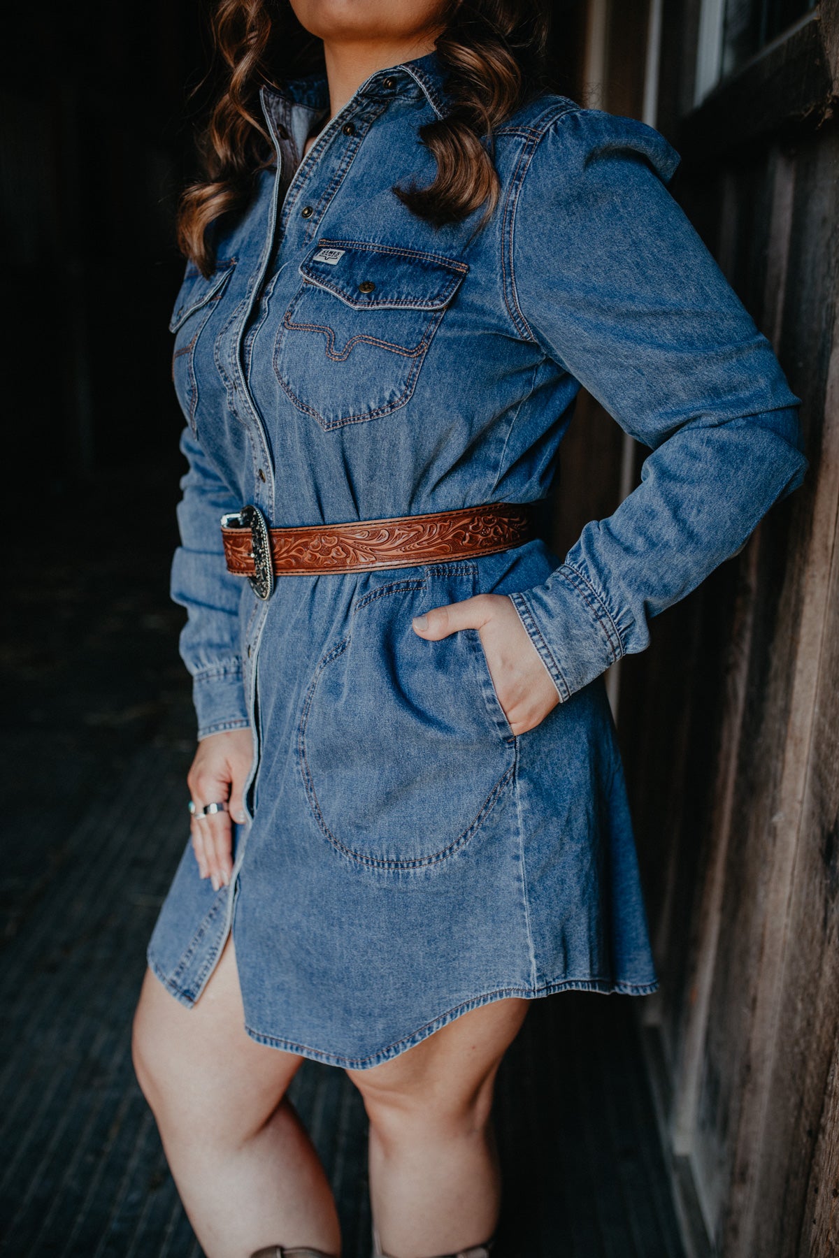 When we saw Kimes made a dress version of their well known and loved denim pearl snaps and button ups - we knew we HAD to bring it to you ladies for this Spring and Summer! Adorable western touches like yoke detailing, concho style buttons, and two chest pockets with that classic Kimes Ranch longhorn logo we all know and love - this denim dress is such a closet must-have!