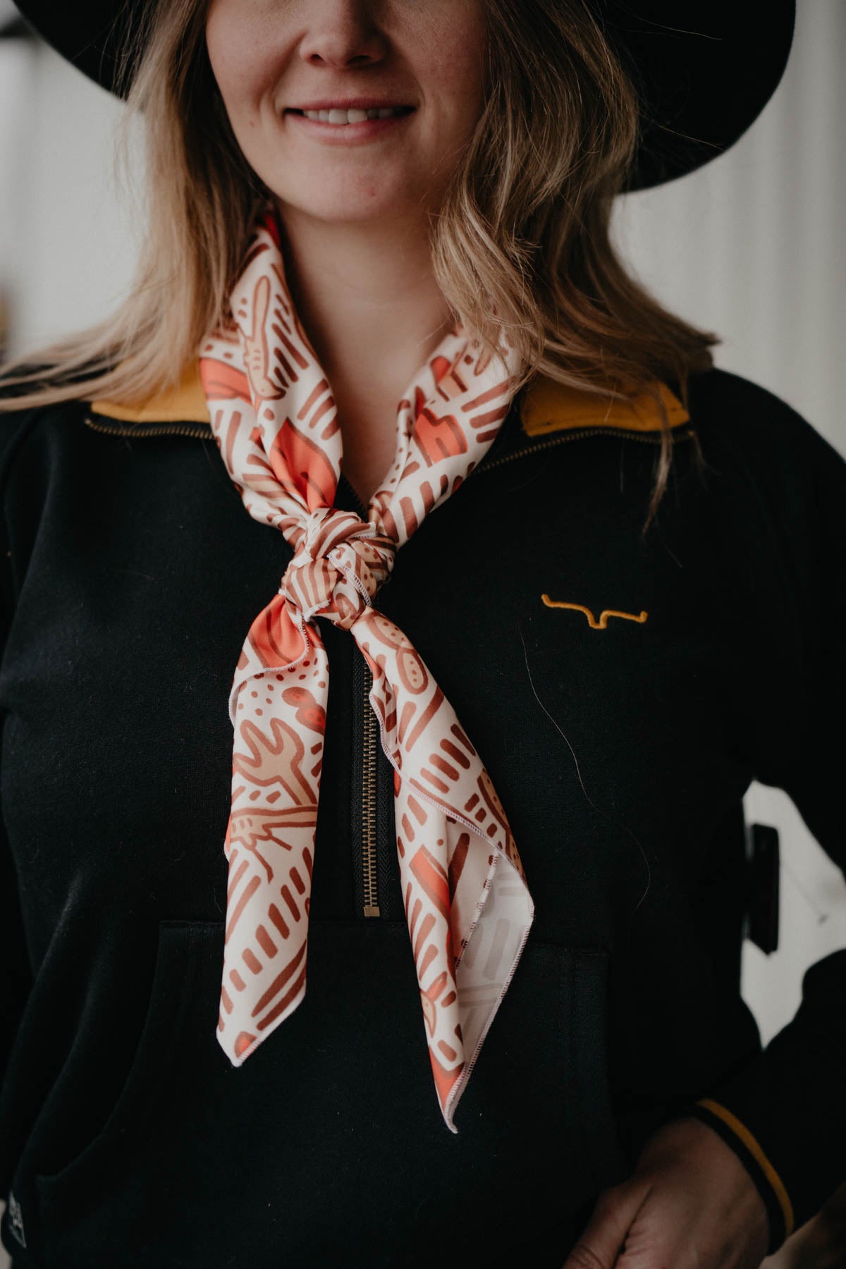 Add warmth and style to your western wardrobe with this ivory satin wild rag featuring an orange abstract cacti and road runner print made by local Ontario company Branded Blue Design! 36" X 36"