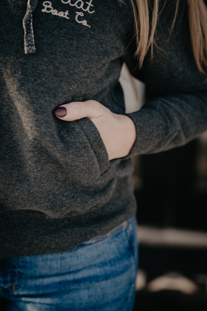 We are loving this full zip this season! The super soft fleece lining is sure to keep you warm this winter while you are out in the barn layered up or sitting cozy by the fire. This sweater has a beautiful horseshoe embossed chest logo. We can not get over how soft this hoodie is both inside and out. The leather zipper pull and hip pockets are perfect additions to this amazing hoodie.