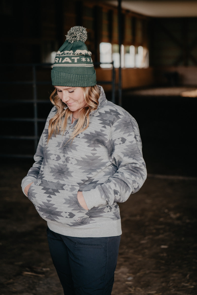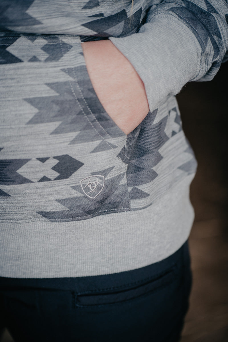 We are absolutely loving this 1/2 zip sweatshirt from Ariat. This sweatshirt is the perfect grab and go for any event. It has the perfect amount of casual style paired with a beautiful western flair print. The kangaroo pocket gives this hoodie the perfect spot to store any of you essentials for whatever task you may encounter. The fleece lining in this hoodie is sure to make is one of your staple pieces this season.