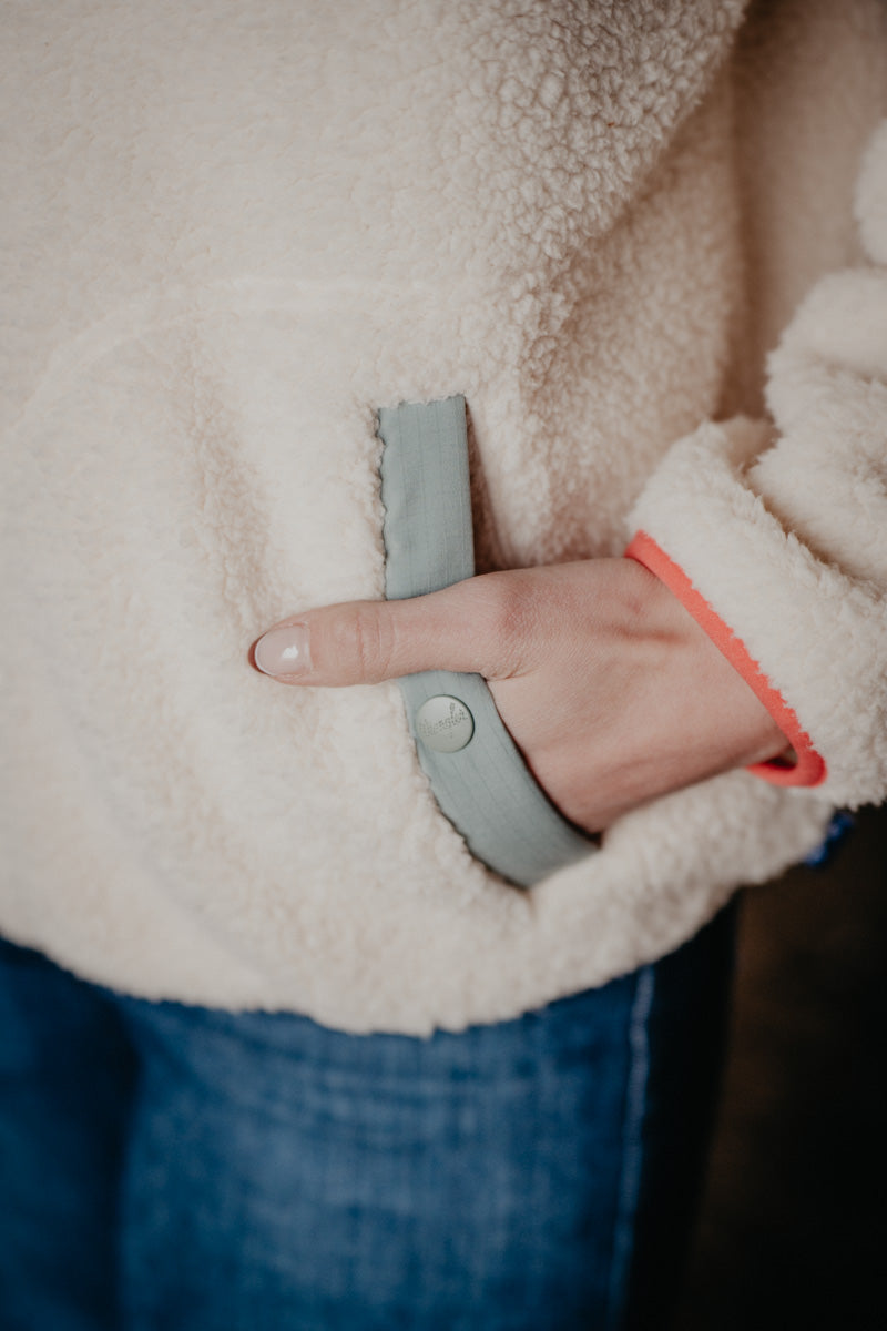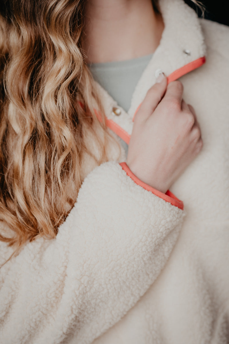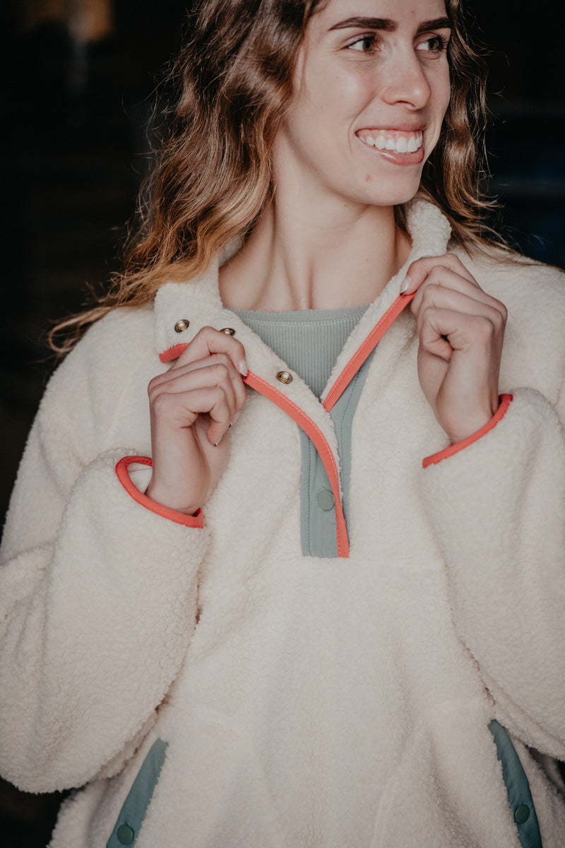 Wrap yourself in the ultimate cozy companion with the 'Skylar' pullover—a cream sherpa dream that's as soft as it gets! Quarter snaps make layering effortless, while teal and corral accents add just the right pop of personality. Practical hip pockets keep your essentials close, and the warm sherpa lining means you'll never want to take it off. Perfect for those chilly days when comfort is non-negotiable!