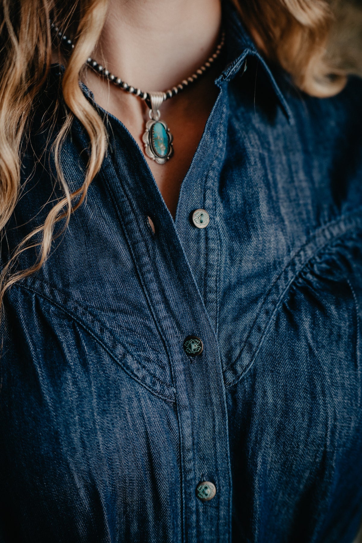 Effortlessly refined with a touch of western chic, the Ariat 'Wendy' Dress is designed for crisp fall days and evening outings in town! Made from a soft denim material, its flattering tiered midi silhouette, long sleeves, and adjustable waist tie belt create a graceful and feminine shape. Featuring classic details like a full button-front closure, yoke accents, and hip pockets, this dress balances timeless design with modern elegance. Style it with boots, a statement belt, or a felt hat to complete a polished fall look perfect for dinner dates or weekend gatherings.