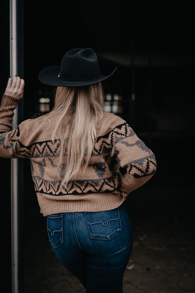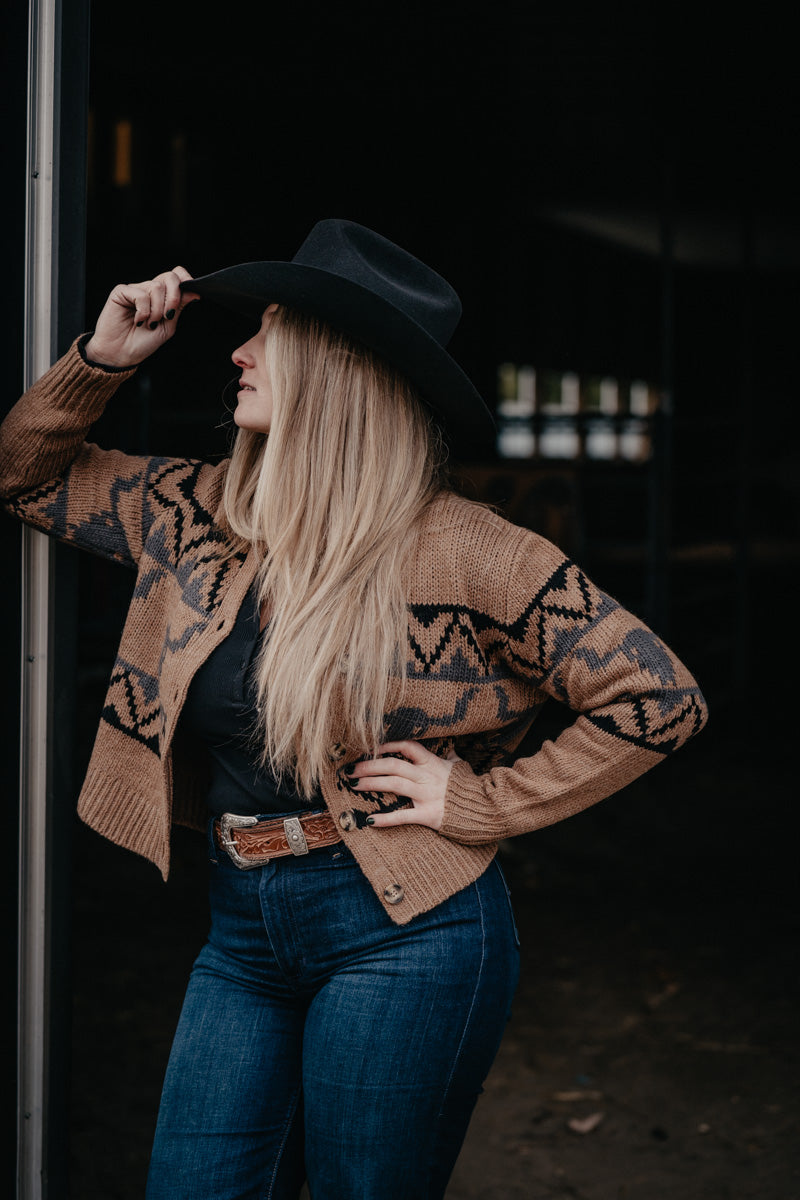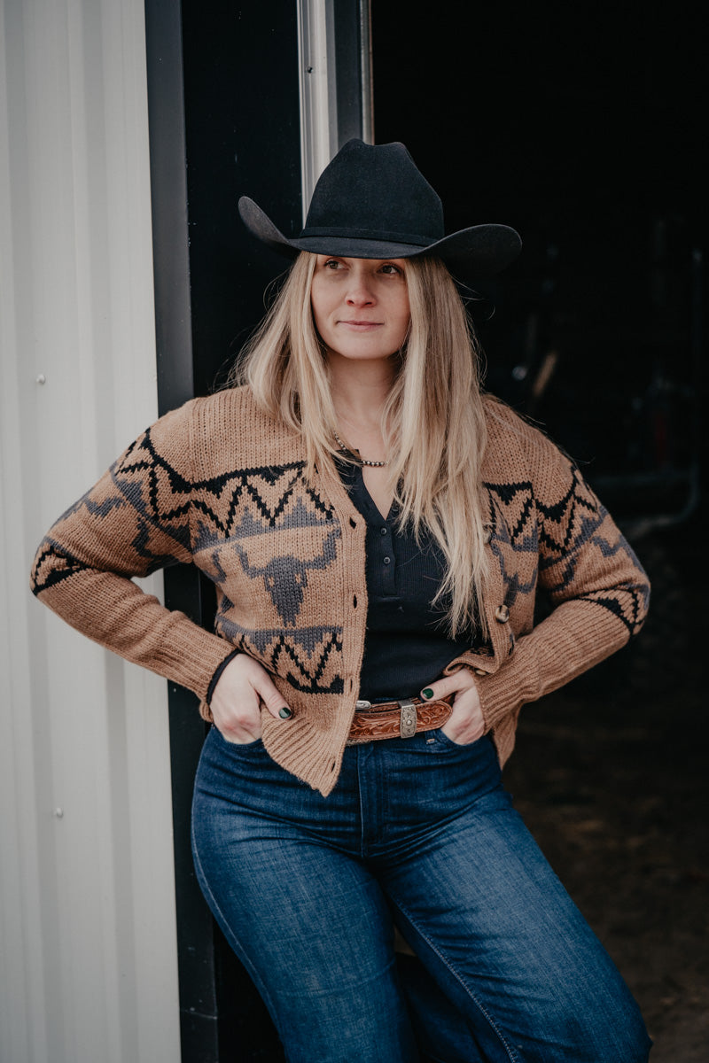 Meet 'Tessie', your new go-to cardigan for effortless Western charm! This beauty hugs your curves just right with its tailored shorter fit, while the eye-catching grey and black longhorn aztec print on a cozy camel base steals the show. Button up front for easy layering and instant style points! Whether you're channeling vintage vibes or mixing modern looks, this Stetson gem has you covered!
