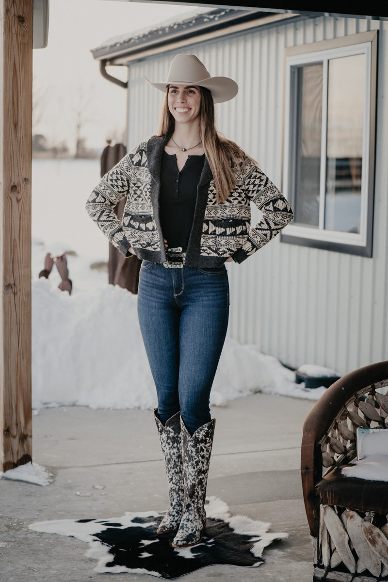 Layer up with the 'Violet' cardigan, where cozy meets stylish! This cropped open-front style features a striking grey and white aztec knit print that brings instant personality to any outfit. Perfect for throwing over your favorite tee or dress, it's the effortless piece that makes getting dressed actually fun!