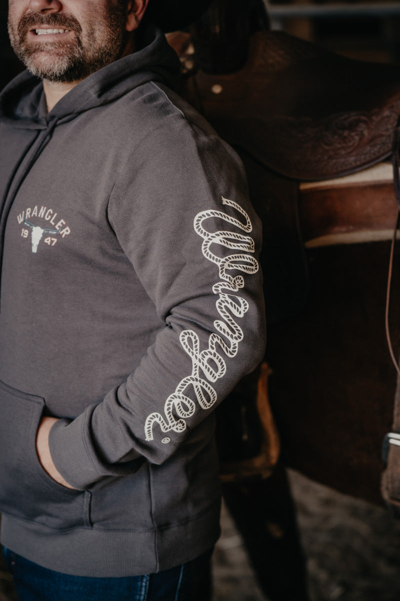 We have got another perfect sweater for all our cowboys out there looking to layer up and stay warm in this cooler weather. This hoodie is great for layering over a shirt its the perfect weight to keep you warm but still let you work with out overheating. We are loving the deep charcoal colour with the longhorn chest logo and large back graphic.