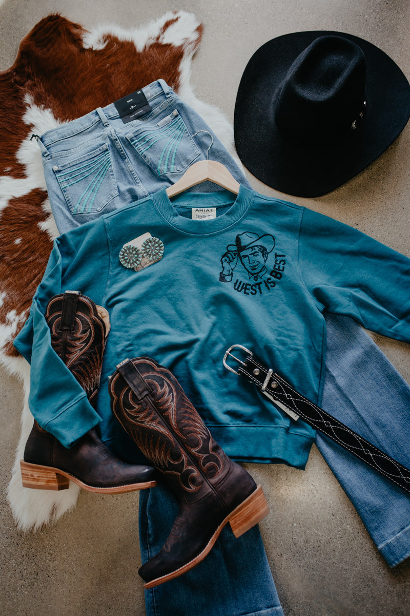 Meet Josie—the sweatshirt that wears its Western attitude on its chest (literally)! This playful Sendero x Ariat collab pairs a soft, long-sleeve crewneck with an embroidered "West is Best" cowboy detail that'll have you grinning every time you catch your reflection. Whether you're channeling ranch vibes or just love a good dose of frontier flair, this essential piece delivers comfort with a wink!