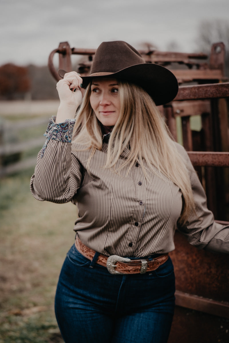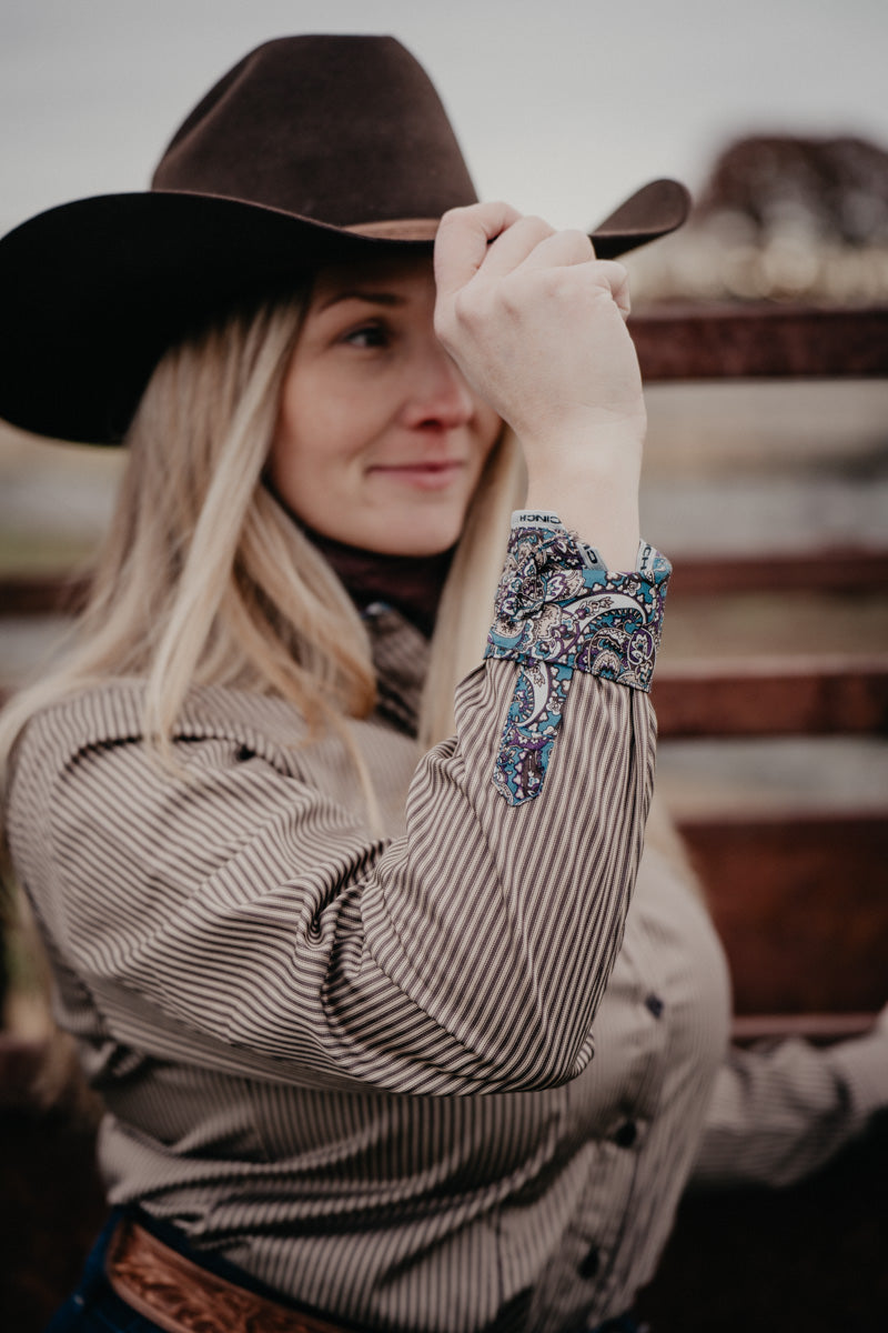 Introducing the 'Marina'—your new go-to for effortless style with serious comfort! This long-sleeve button-up features a stunning dark brown and taupe pinstripe that pairs beautifully with the eye-catching contrast cuff in forest green, dark purple, tan, and cream. Crafted from stretch fabric, it moves with you through your day, offering the perfect balance of polish and flexibility.!