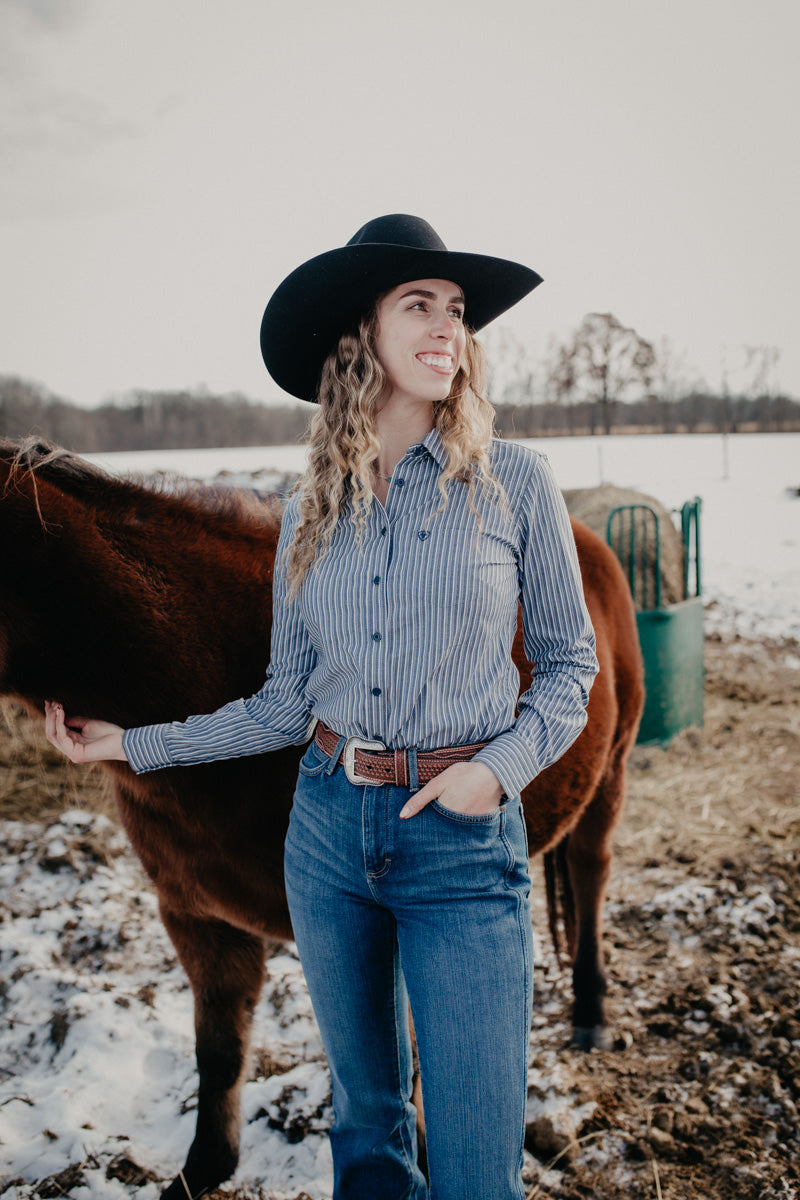 Ariat Kirby button up's are a staple around here and for good reason! Breathable material for comfortable all day wear, and classic fit that tucks into jeans easily and will stay put while riding, doing chores, or headed into town; this shirt has you covered! We love the retro stripe pattern in deep blues, white and a bit of sparkle.