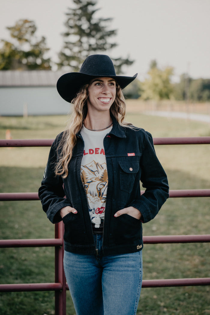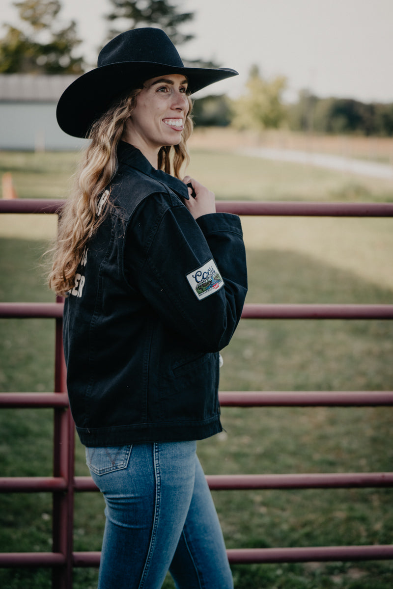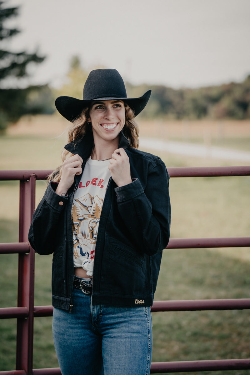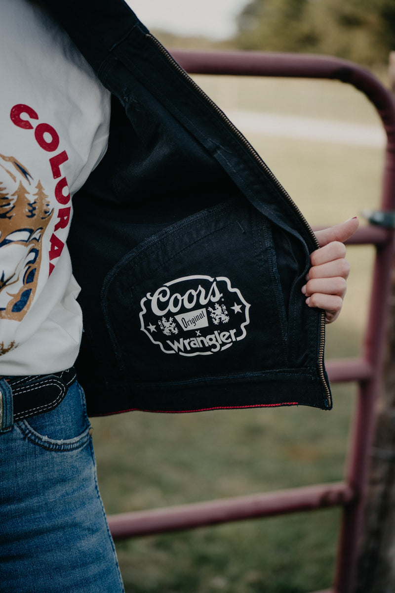 This Wrangler X Coors black denim Jacket is the perfect addition to any wardrobe. This jacket is a statement piece for rodeo circuits, country music concerts, and backroad tours. This mashup offers a modern twist on the traditional truckers jacket. With a full zip front this jacket is perfect for layering in the cooler months.